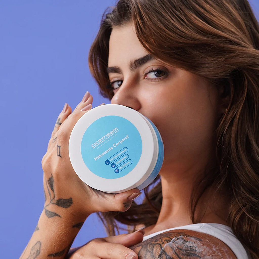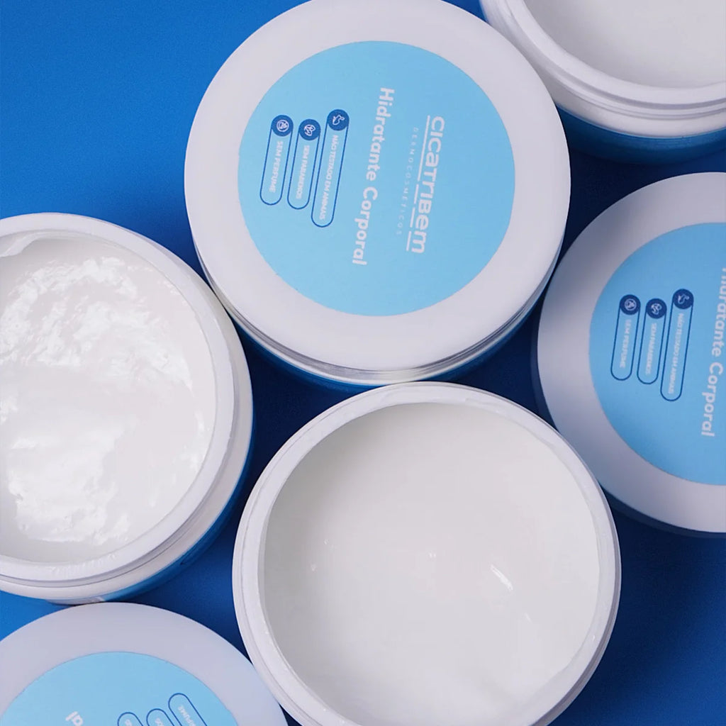 O Hidratante Corporal sem perfume Cicatribem, enriquecido com óleo mineral, extrato de aveia e óleo de girassol, hidrata e ilumina a pele.